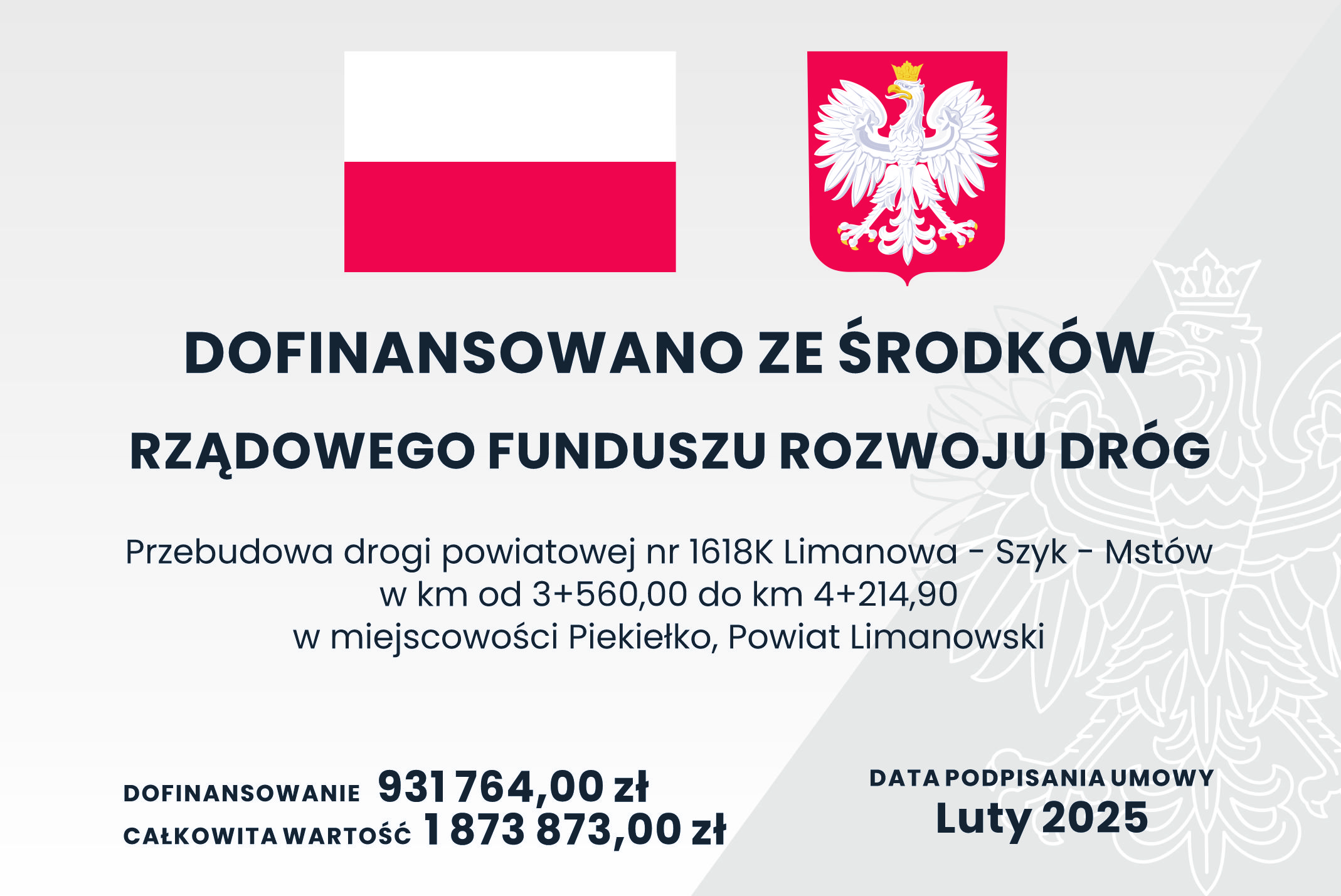 „Przebudowa drogi powiatowej nr 1618 K Limanowa – Szyk – Mstów w km od 3+560,00 do km 4+214,90 w miejscowości Piekiełko, Powiat Limanowski”
